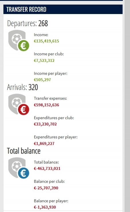 平均到每俱乐部的差额:-2570.739万欧元